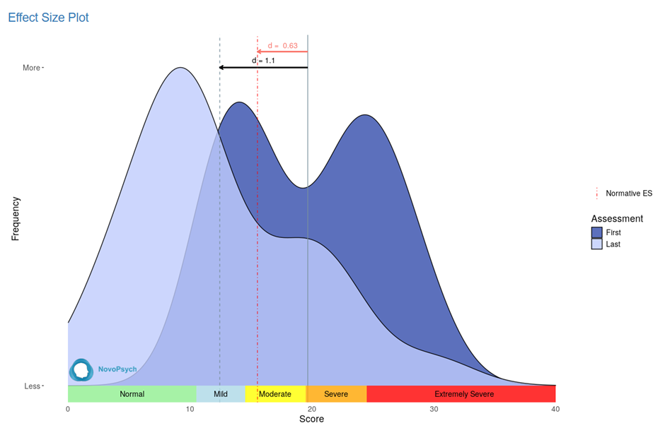 Of the the clients who did complete the Core 10 more than twice, Novopsych calculated my effect size as 1.1. Put another way, the average client that completed therapy with me went from scoring in the “severe” range on the core 10 to the “mild range.”
