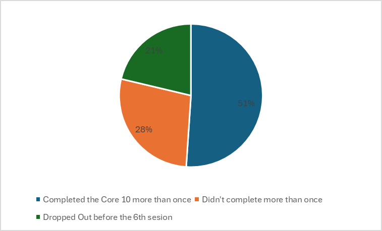 The below pie chart has my dropout % and the % of clients who did the Core 10 more than once.